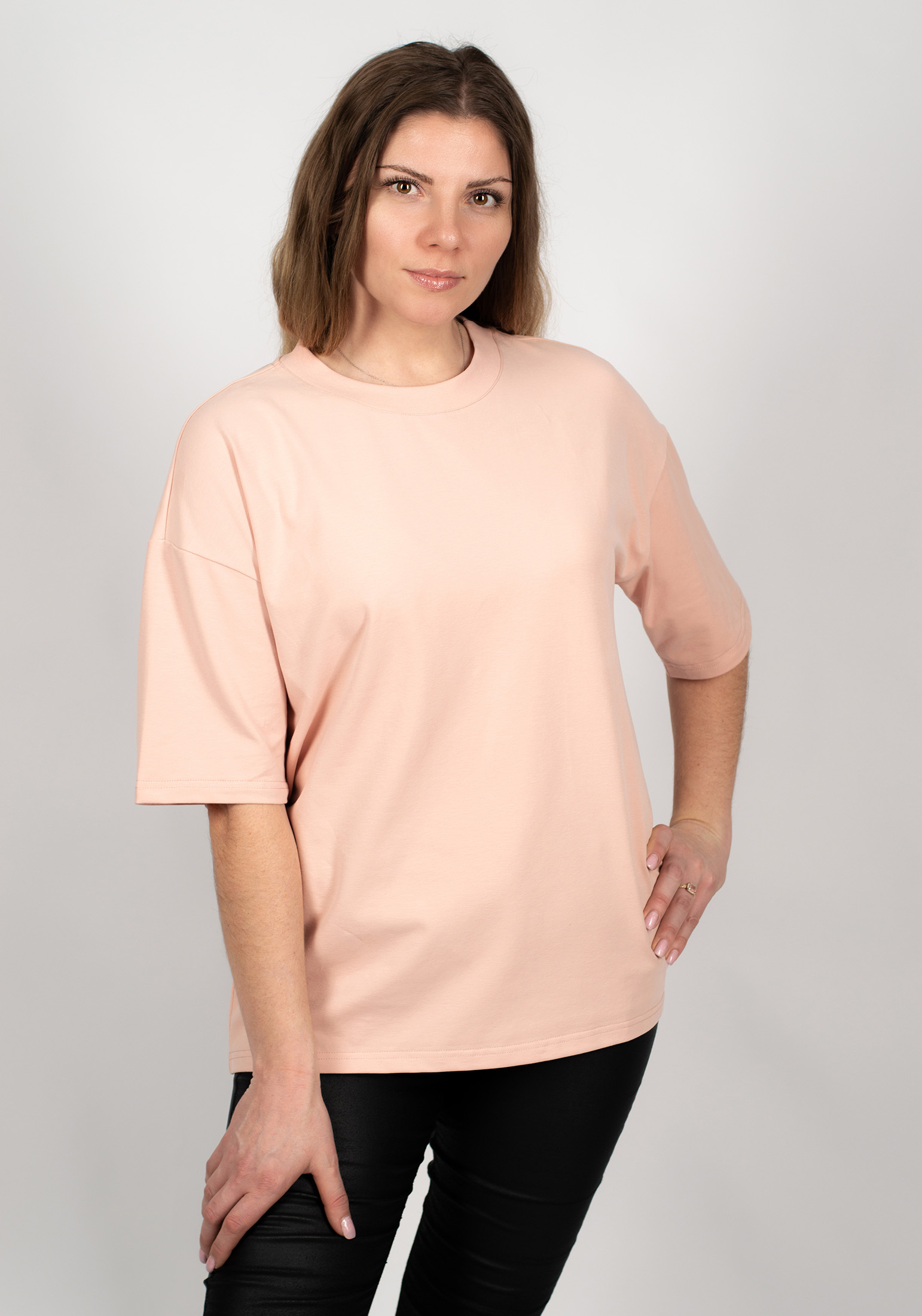 Стильная базовая женская футболка из премиального турецкого трикотажного полотна в стиле OVERSIZE с peach эффектом. Модель прямого, свободного кроя, с круглым вырезом ворота и спущенной линией плеча. Женская футболка - это базовая вещь в гардеробе любой современной девушки и женщины, является одной из самых удобных, популярных и незаменимых моделей одежды круглый год, сделает образ изысканным и современным. Наши невероятно удобные футболки отлично сочетаются с шортами, джинсами, юбками, джоггерами, кюлотами. Свободный крой и элегантная форма рукавов не только придают изделию стильный и модный вид, но и гарантируют его обладательнице комфорт даже в самые жаркие дни. Футболка - самый универсальный предмет женского гардероба, который подходит под любой образ, от строгой классики до спортивного стиля. Гладить с изнанки. Стирка при t не более30С. Деликатный отжим, отбеливание запрещено